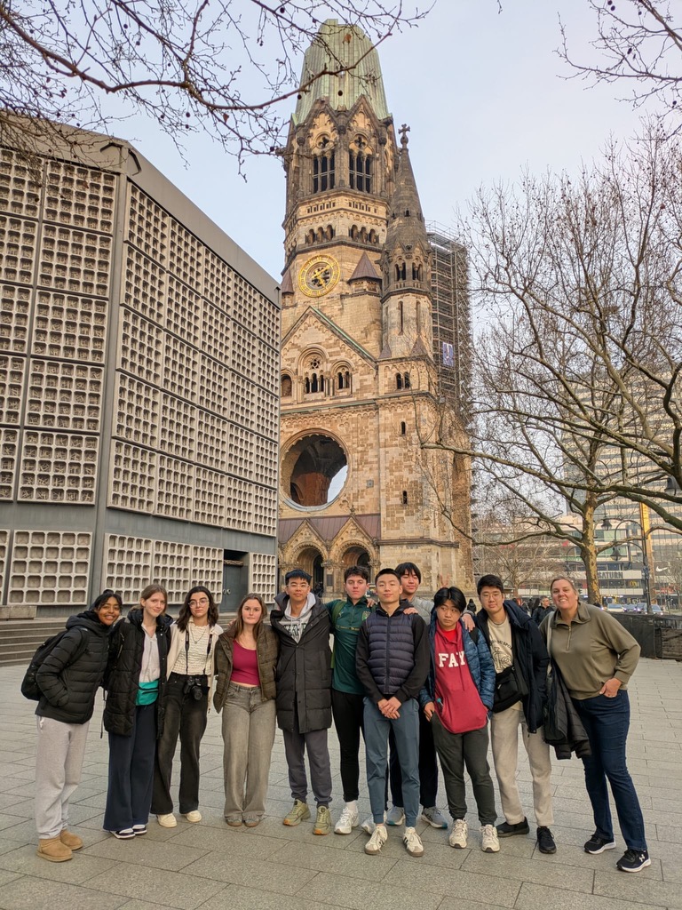 This March break, 11 students and two faculty members are traveling to Berlin, Prague, and Krakow to explore the idea of monuments and memorials and their role in public memory, and learn more about the Holocaust and how Germany, Czechoslovakia, and Poland responded in the late 20th century and early 21st century to the study of Holocaust memory, public art, and their fusion in contemporary life. Please enjoy the blog post below from Sophie ’27 where she shares about how the group’s journey to Berlin, after a long day of travel, led to a memorable visit to the Kaiser-Wilhelm-Gedächtniskirche, where they reflected on the church’s historical significance as a memorial to the destruction of World War II.