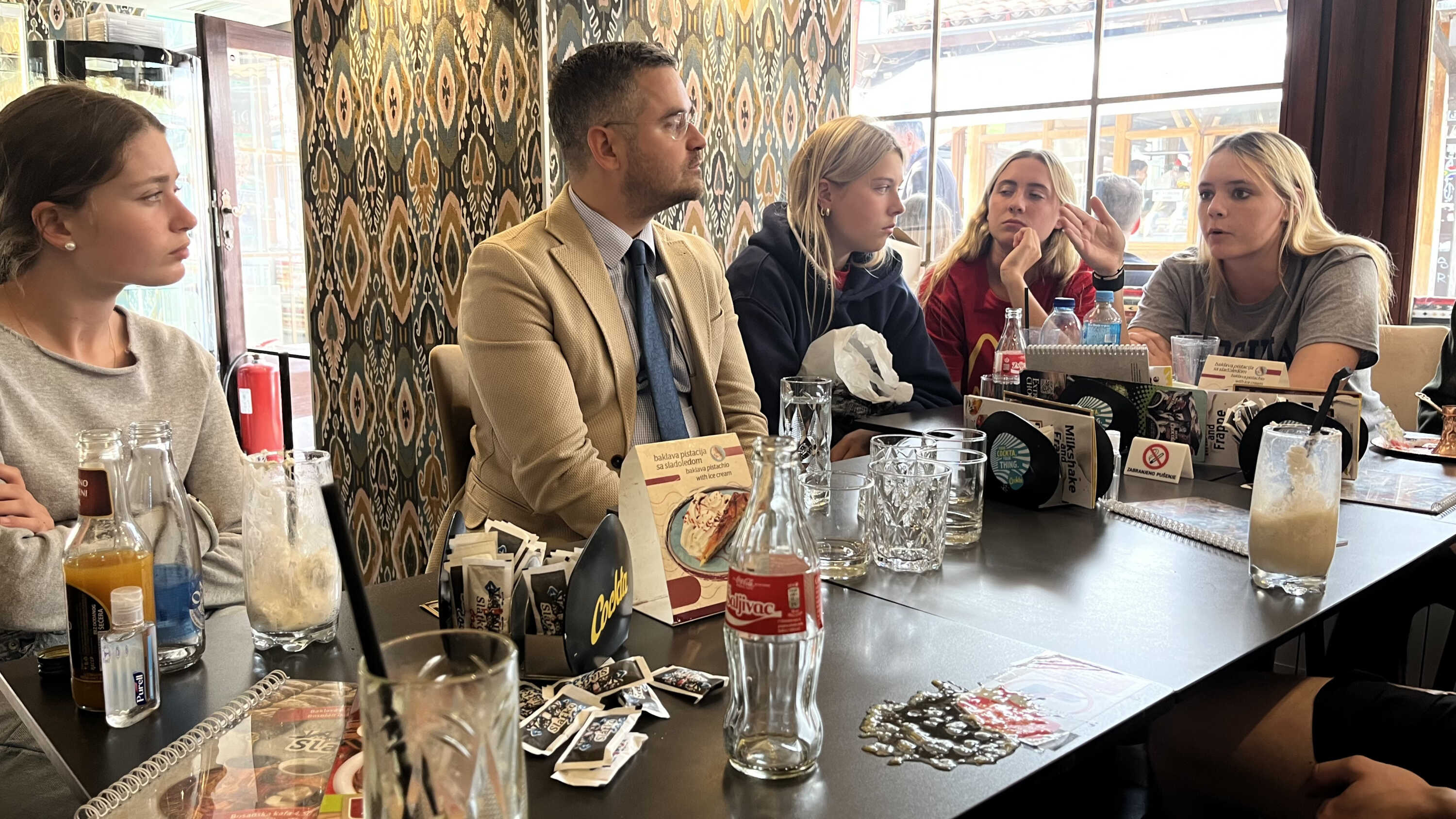 After stopping for a classic Bosnian lunch of special cevapi sausages, pita, and onions, we went to meet up with our guide Arna for a history and culture tour of Sarajevo. Listening to Arna’s perspective on the old Yugoslavia that no longer exists was super interesting: you could travel from this nonaligned country to others in both the eastern and western blocs of the Cold War – she remembered going on ski trips even though life wasn’t “extravagant.” Arna also provided her viewpoint on Bosnia’s current political and economic state, and mentioned that the pause on USAID would have a big impact on development NGOs. During the tour, we got to see the spot where over 100 years ago, the Archduke Franz Ferdinand of Austria-Hungary was assassinated, providing the spark that would start the First World War. Arna also seemed to know everyone in the town and brought us into several shops and stores to try “burek” and sweets and examine goods produced in the region.
