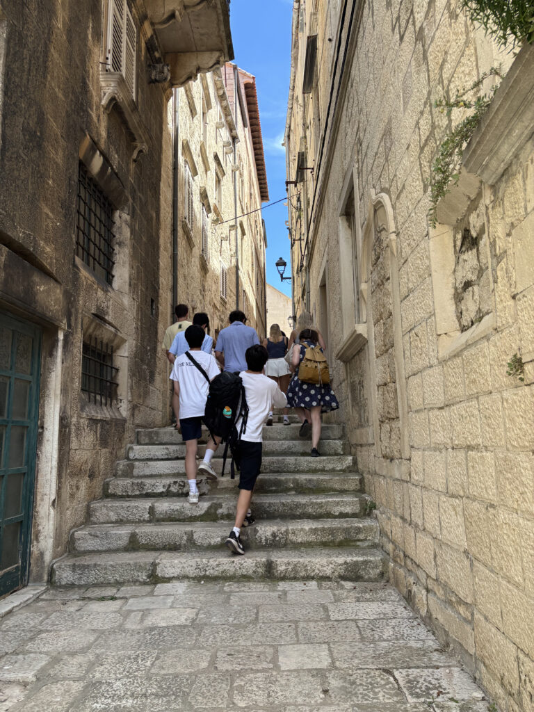 This summer, 11 Students and two faculty members are traveling to Croatia, Serbia, and Bosnia to learn about the 20th-century history of the countries formerly known as Yugoslavia and begin to unravel the complex reverberations of Conflict. Please enjoy this blog post below from Anais ’26 and Travis ’26 where they share about their peaceful day of swimming, shopping, and exploring Korčula, capped by a moving tour with a local guide whose stories of resilience, community, and post-war life brought depth and humanity to the island’s natural beauty.
