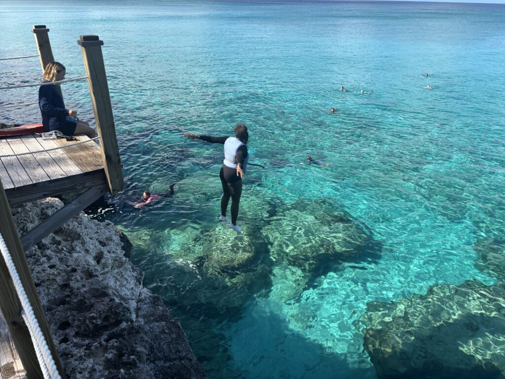 Our second activity of the day was going to High Rock, a cherished place by the island school, getting to learn the history of it and get the opportunity to jump off it. Precious ’28 describes how she “then got ready to face my fear of both heights and deep ocean water by jumping off of a high rock deck and into 15 ft of ocean water. I watched one of the staff members, Em, jump in and come up to the surface of the water looking calm and happy. I watched more and more people jumping in and looking joyful but relieved at the same time. It was then my turn, and I was scared because I felt my fears coming back to me again. Others were talking about the stomach drop feeling they get when jumping off. It made me freak out even more as I started taking a number of deep breaths. I got my friends who already jumped to give me words of affirmation as I felt my fears drifting away slowly. They counted down for me and it took almost 10 tries before I could finally gather up the energy to jump off. 3…..2….1…splash. I felt as if I was in the air for 10 full seconds. My stomach dropped all the way to my feet at the last thing I felt was my body hitting the surface. I slowly rose up to the top and realized I did what I was most afraid of. It felt really nice to do something I wouldn’t normally do while having my friends cheer me on in the process. After we snorkeled and conquered my fear I jumped two more times, dropping 39 ft into the ocean. I couldn’t have jumped without the help of my friends and the encouragement of staff and Mr. Gieske (Happy birthday) and Ms. R-L.”